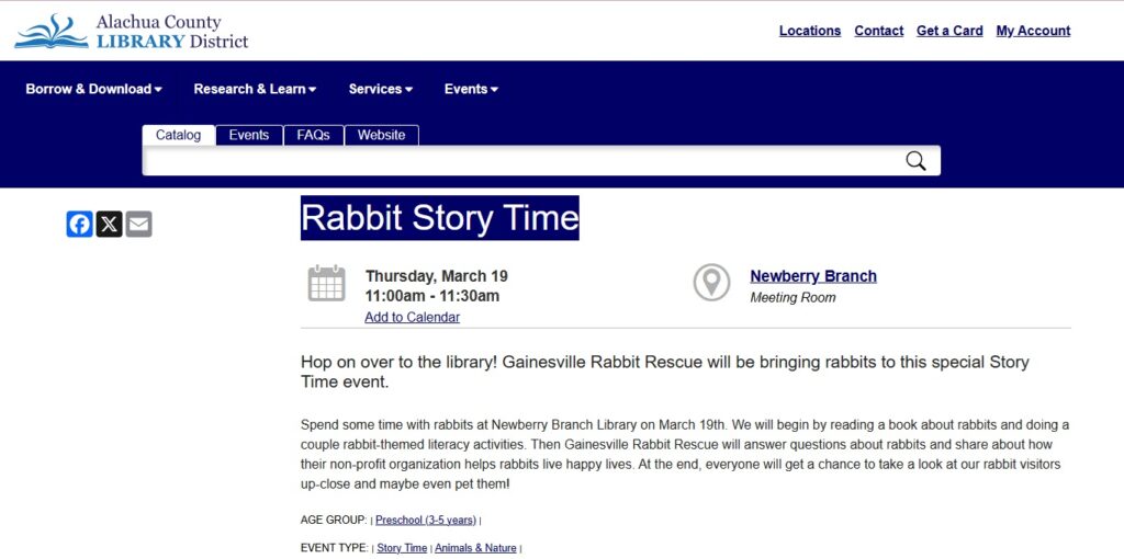 Rabbit Story Time at the Newberry Branch of the Alachua County Public Library on Thursday, March 19: 11:00am – 11:30am