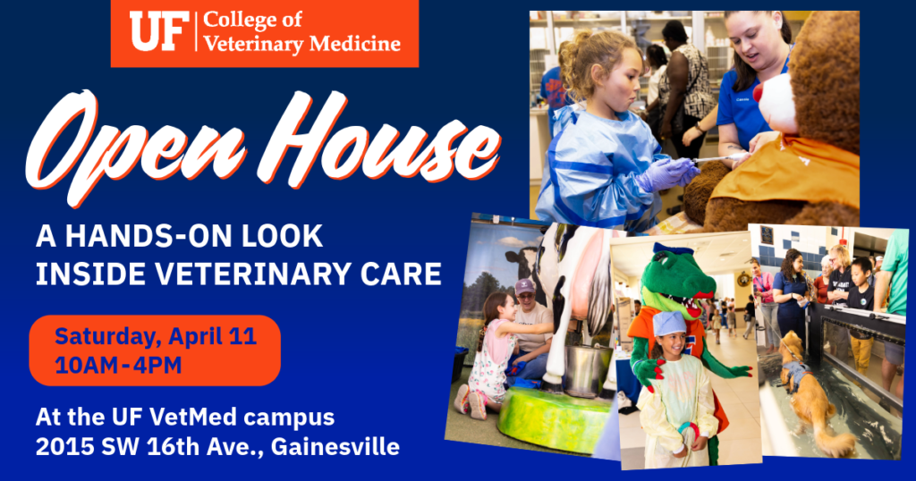 UF College of Veterinary Medicine Open House & Community Outreach Event on Saturday, April 11th from 10 AM to 4 PM at the UF VetMed campus