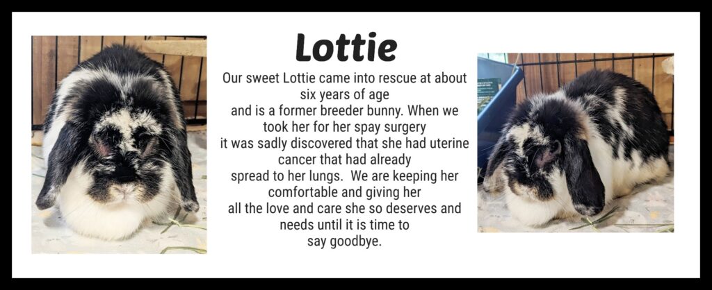 We are sad to let everyone know that Lottie was helped over the Bridge on December 20, 2025. If you would still like to help us by donating in Lottie’s memory, click here to Donate.